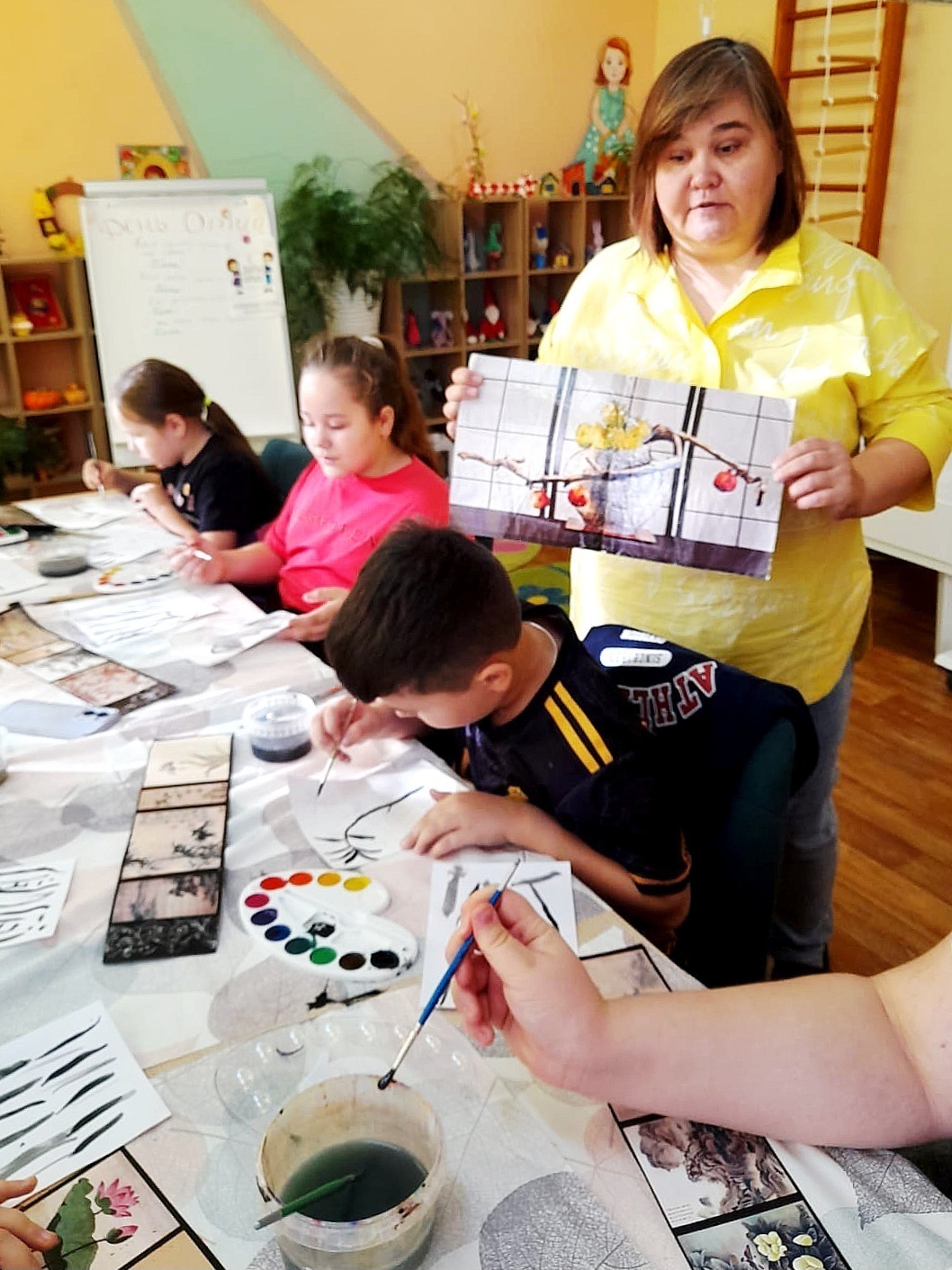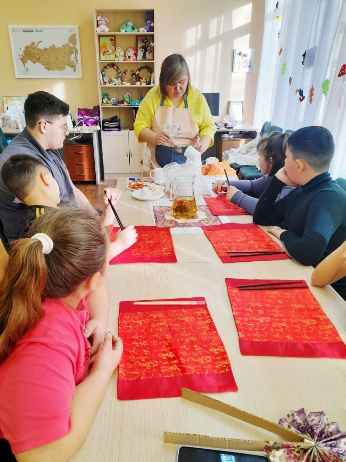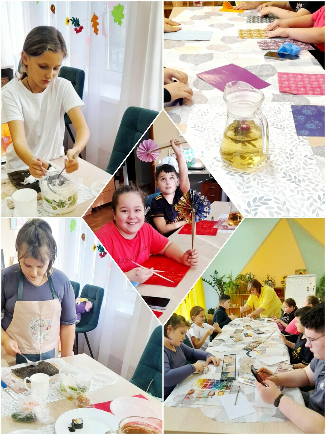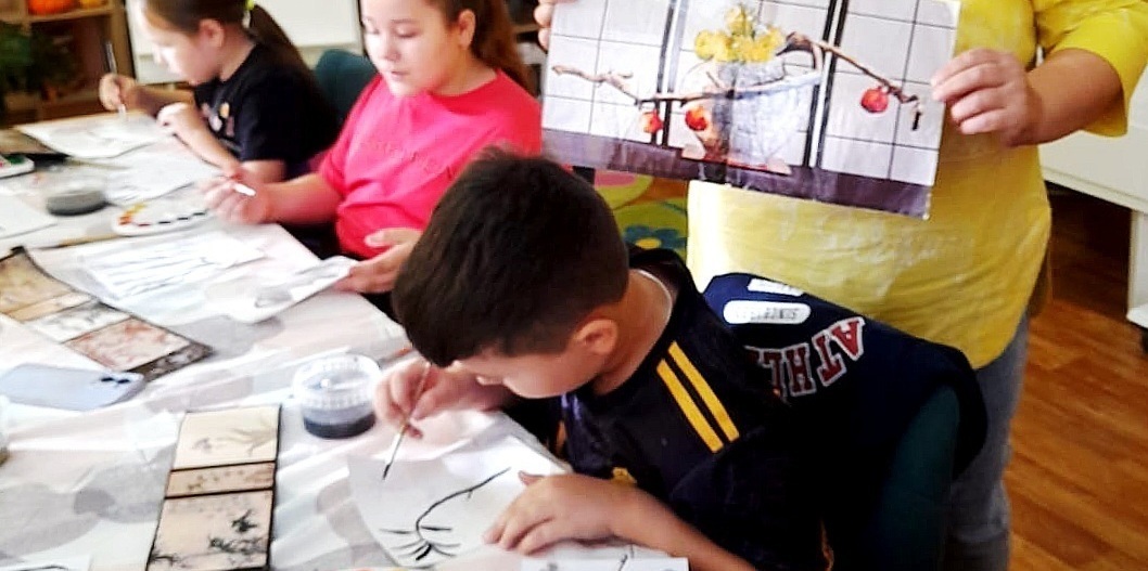 Мальчики и девочки познакомились с особенностями японской живописи, иероглифами, экибаной. Своими руками изготовили веера, которыми пользуются японские женщины. Затем узнали о традиционном чаепитии, пили ароматный чай.