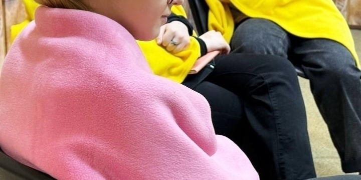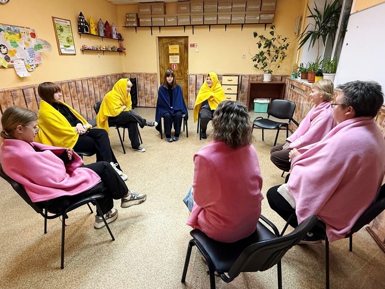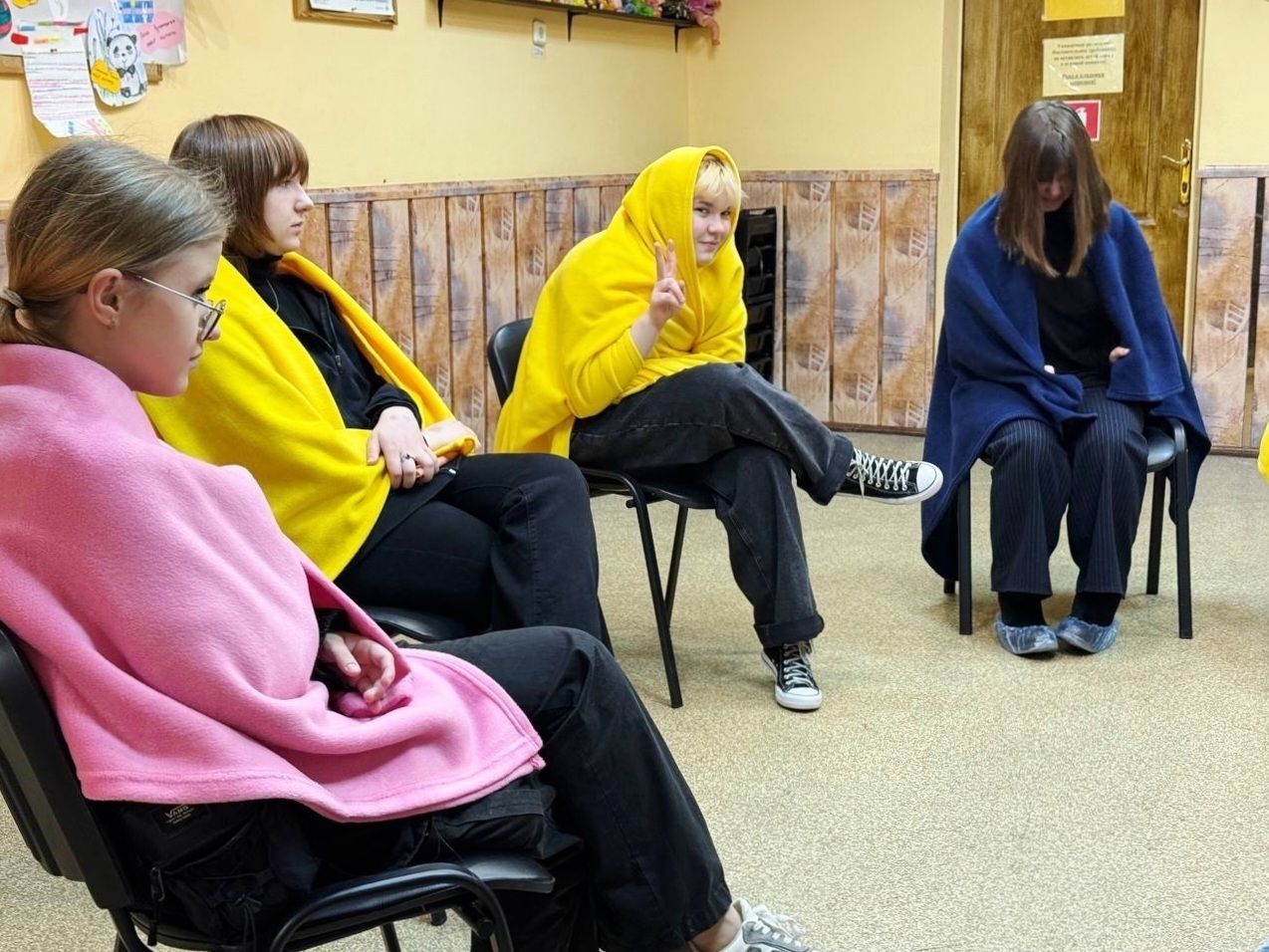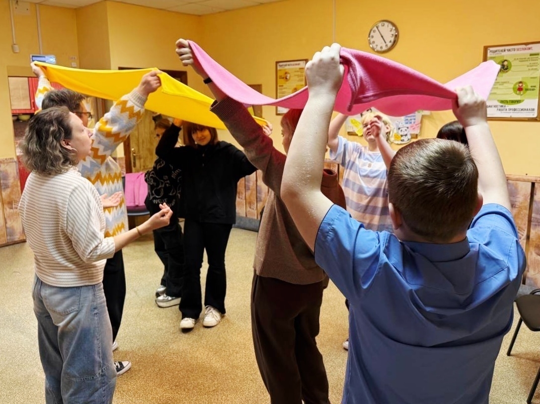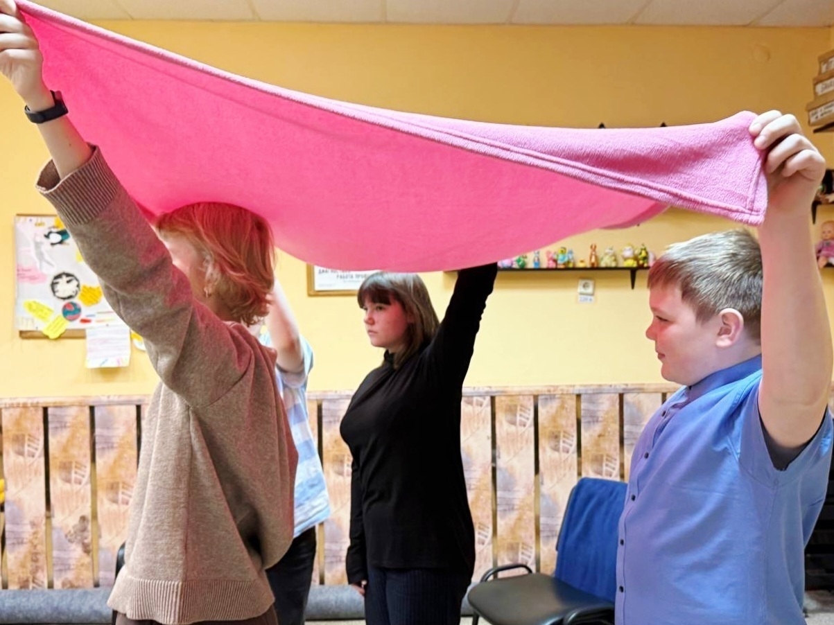 С помощью разноцветных пледов выполняли упражнения на снятие напряжения