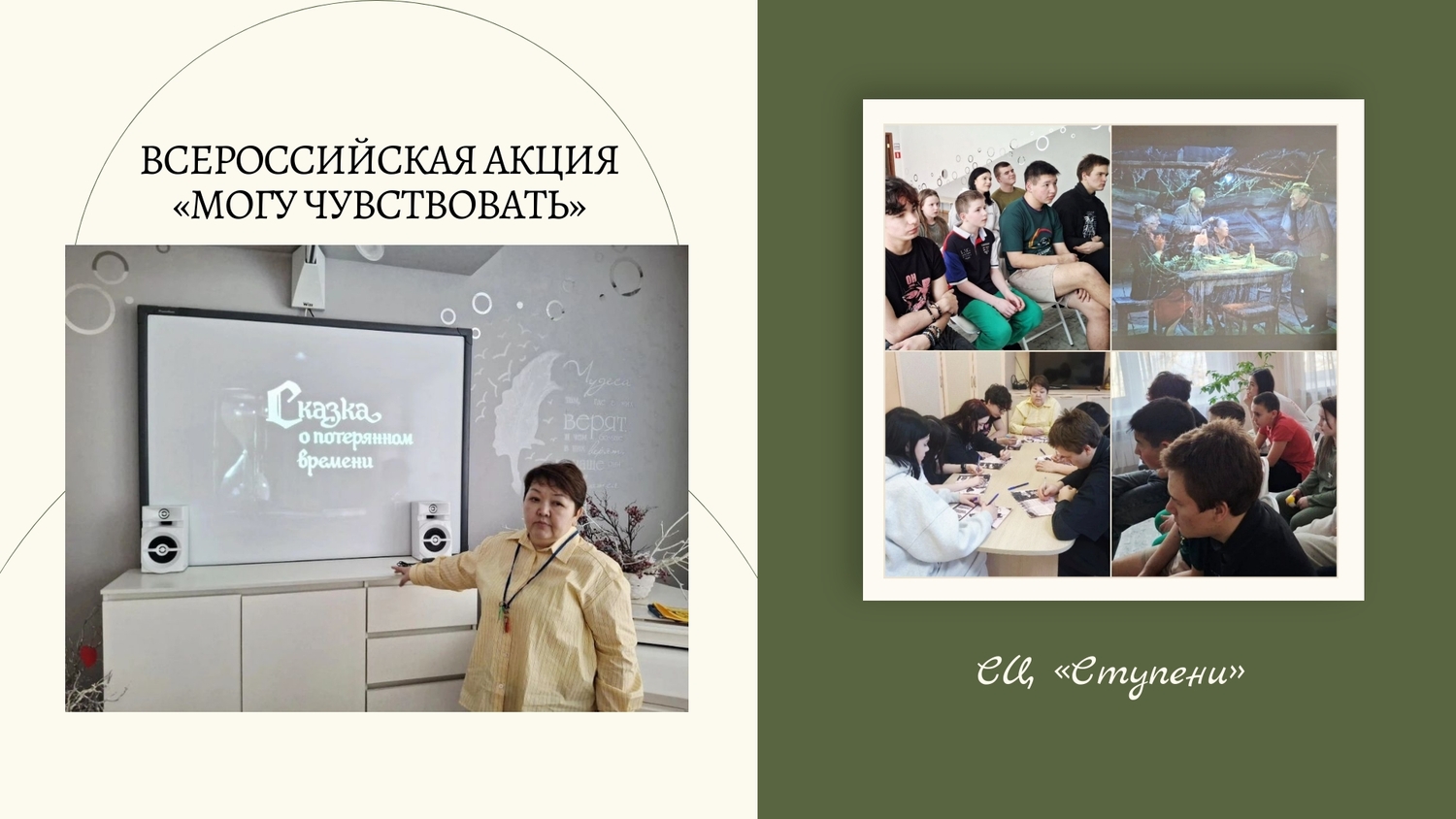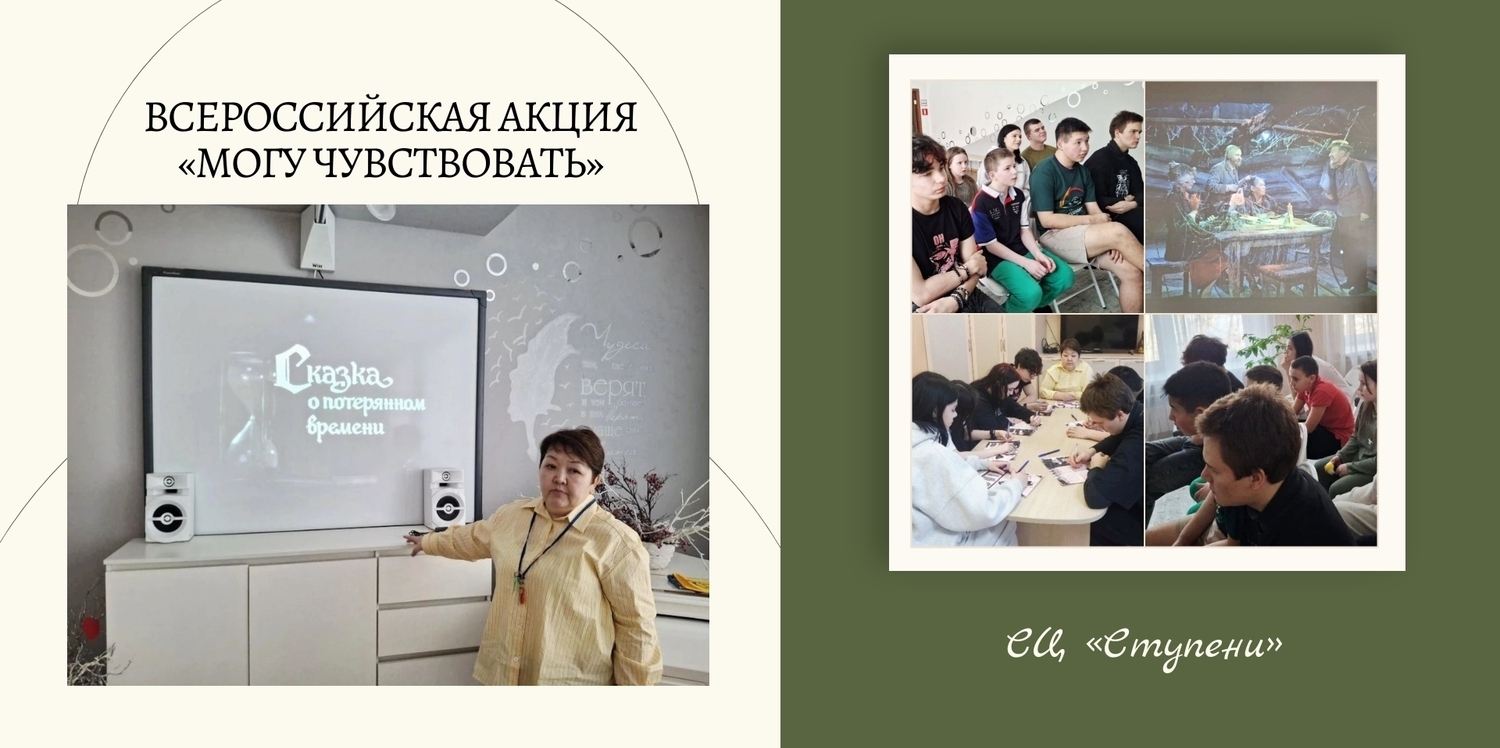 В рамках Всероссийской акции «Могу чувствовать» 20 марта для воспитанников стационара был организован просмотр фильма «Сказка о потерянном времени». В рамках мероприятия обсудили сложные эмоции — злость и ощущение безопасности; тему справедливости; как важно ценить время и быть добрым к окружающим. В заключение заполнили анкету обратной связи.