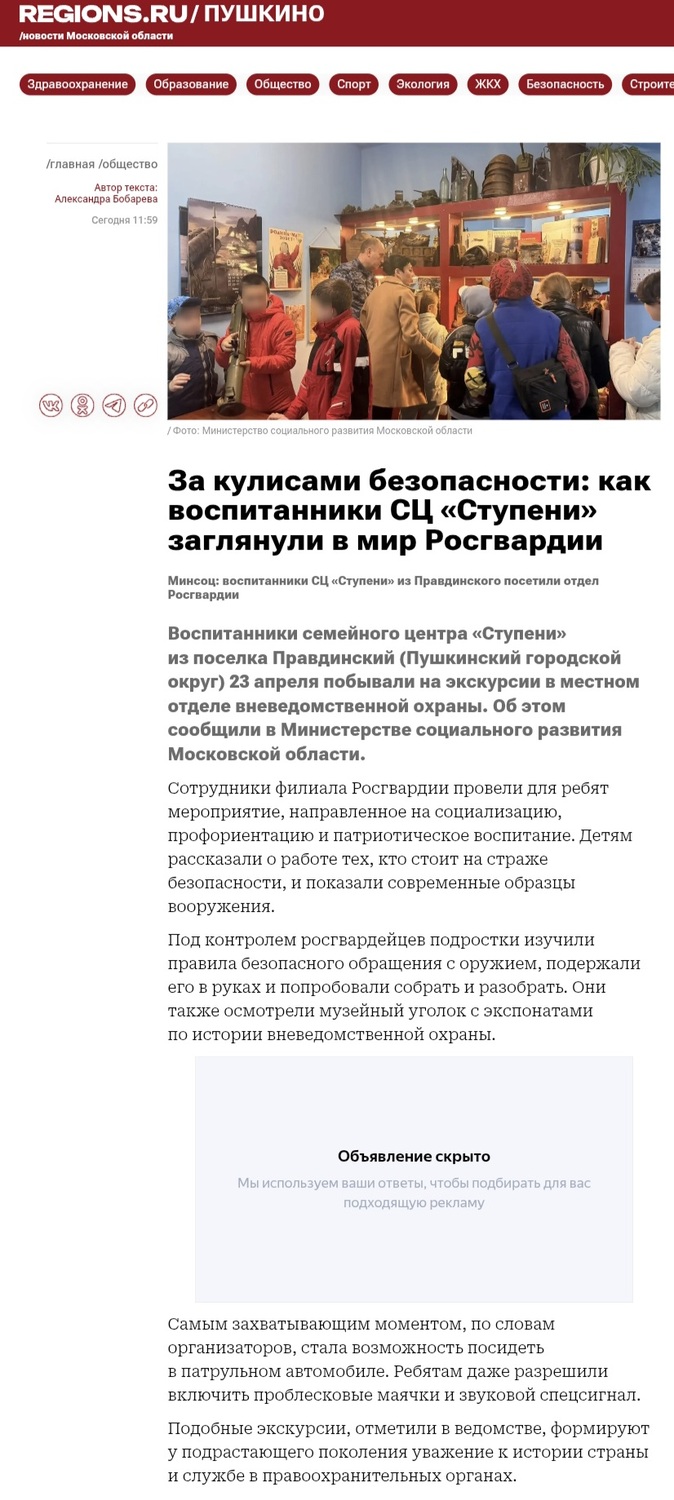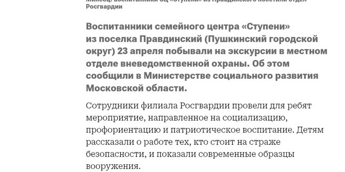 Сегодня воспитанники стационара посетили Пушкинский ОВО – филиал ФГКУ «Управление вневедомственной охраны войск национальной гвардии Российской Федерации по Московской области», сотрудники которого провели мероприятие, направленное на социализацию, профессиональную ориентацию и патриотическое воспитание детей и подростков.