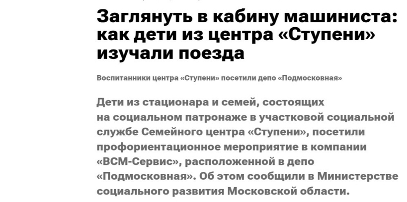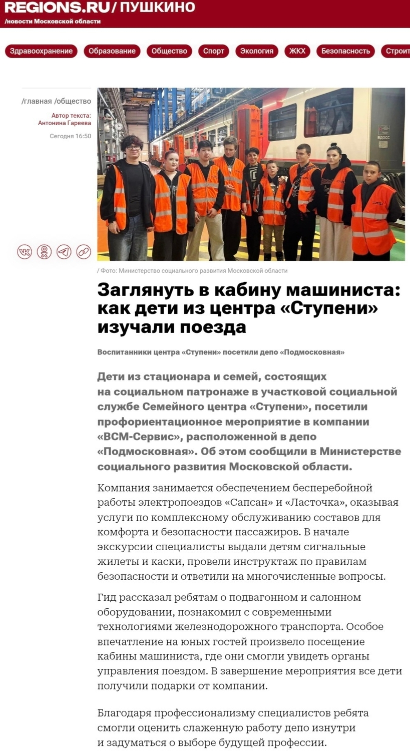 На новостном портале REGIONS.RU вышла статья: «Заглянуть в кабину машиниста: как дети из центра «Ступени» изучали поезда».