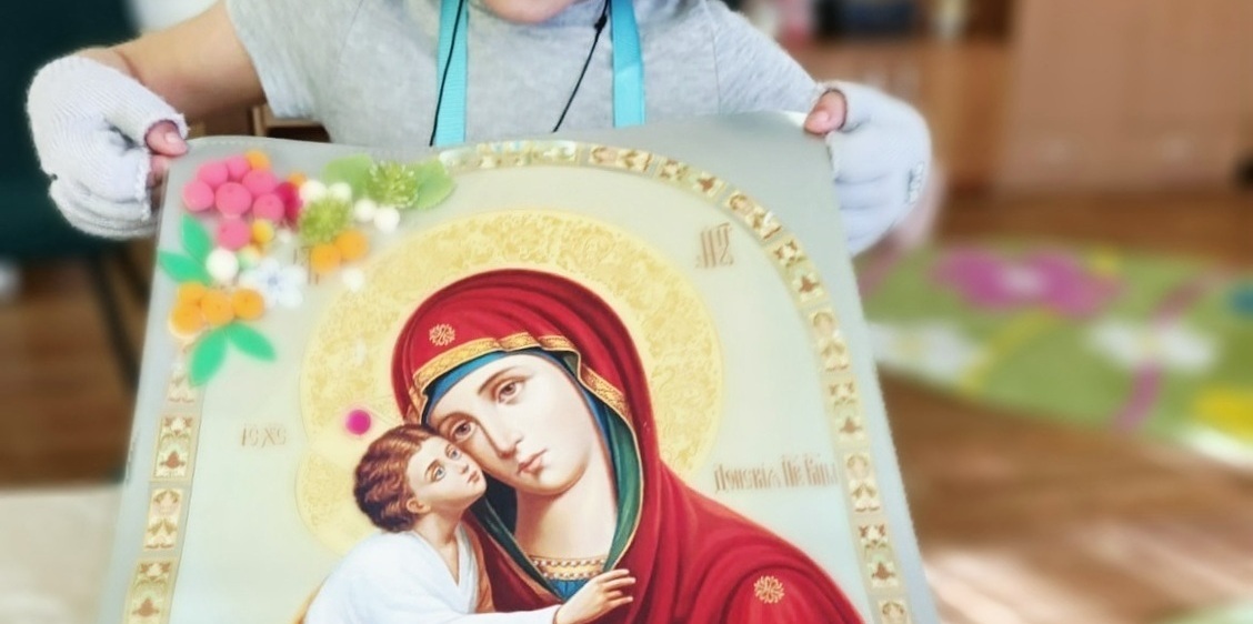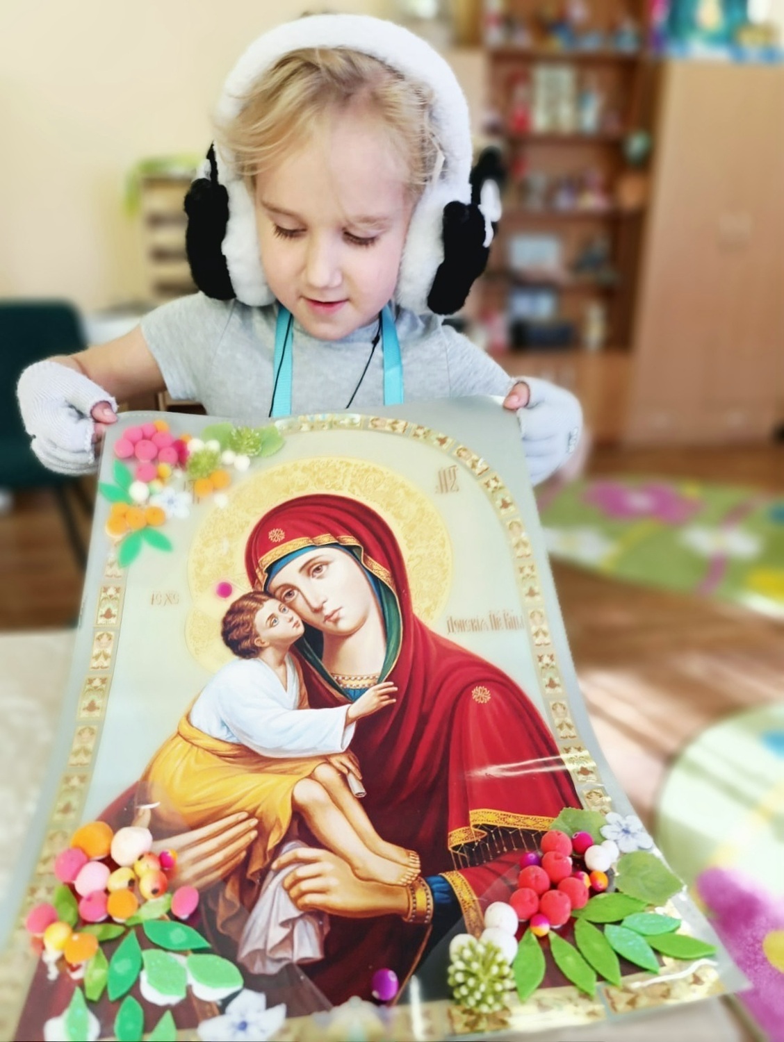 - ️ Украсили икону цветами и ягодками из фетра и воздушного пластилина к празднику Рождества Пресвятой Богородицы.