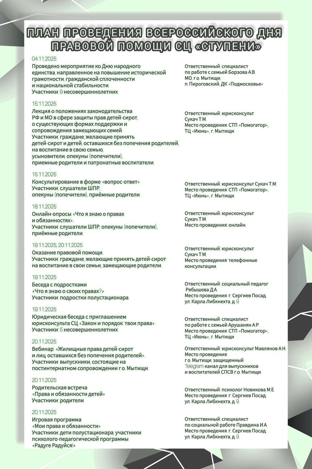 16 ноября отмечался Всемирный День памяти жертв ДТП — день, который призван привлечь внимание к трагическим последствиям дорожно-транспортных происшествий и напомнить о важности соблюдения правил дорожного движения. В центре состоялся творческий час, в ходе которого воспитанник вместе с педагогом изготовили своими руками ангелочков в память о тех, кто ушел из жизни на дороге. Творческий процесс способствовал обсуждению правил безопасного поведения на дороге, а готовые работы ребенок подарил директору Александре Юрьевне и старшей медицинской сестре Елене Борисовне.