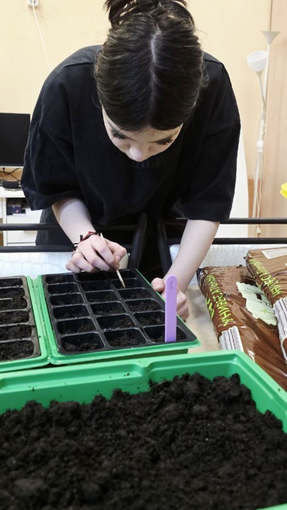 Работа с грунтом стала настоящим искусством – каждый шаг был продуман, и юные садоводы с удовольствием погрузились в процесс: подготовили почву, увлажнили ее, пользовались пинцетом, чтобы не повредить хрупкие семена.