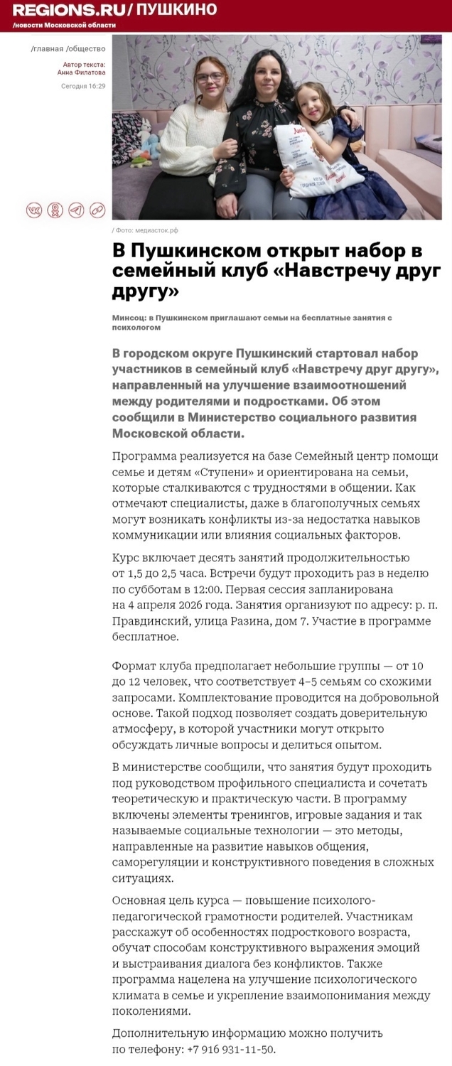 На новостном портале REGIONS.RU вышла статья: «В Пушкинском открыт набор в семейный клуб "Навстречу друг другу"».