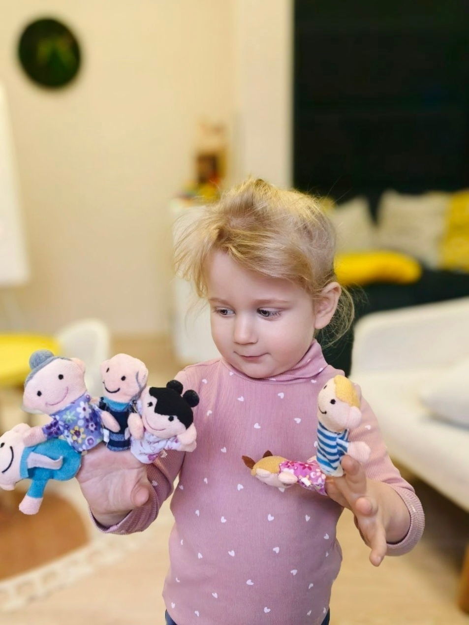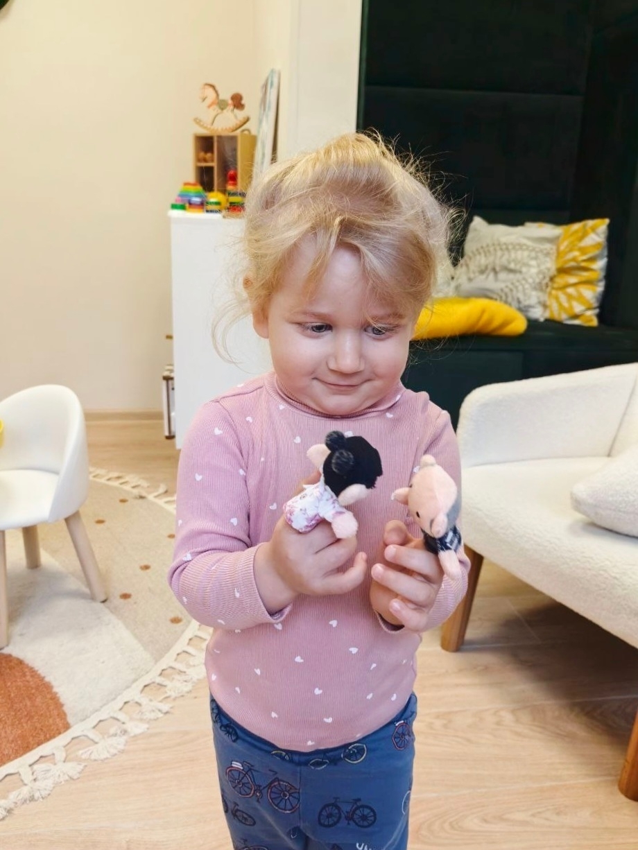 Воспитанница постарше управляла перчаточными куклами – имитировала повседневные действия, представляла различные ситуации и разыгрывала сценки. Это позволило продолжить работу над формированием у ребенка связной и диалогической речи.