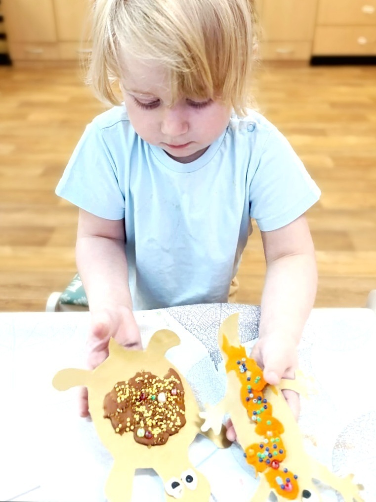 - ️ На занятии в творческой мастерской украшали пластилином и бусинками готовые шаблоны ящерицы и черепашки из картона.