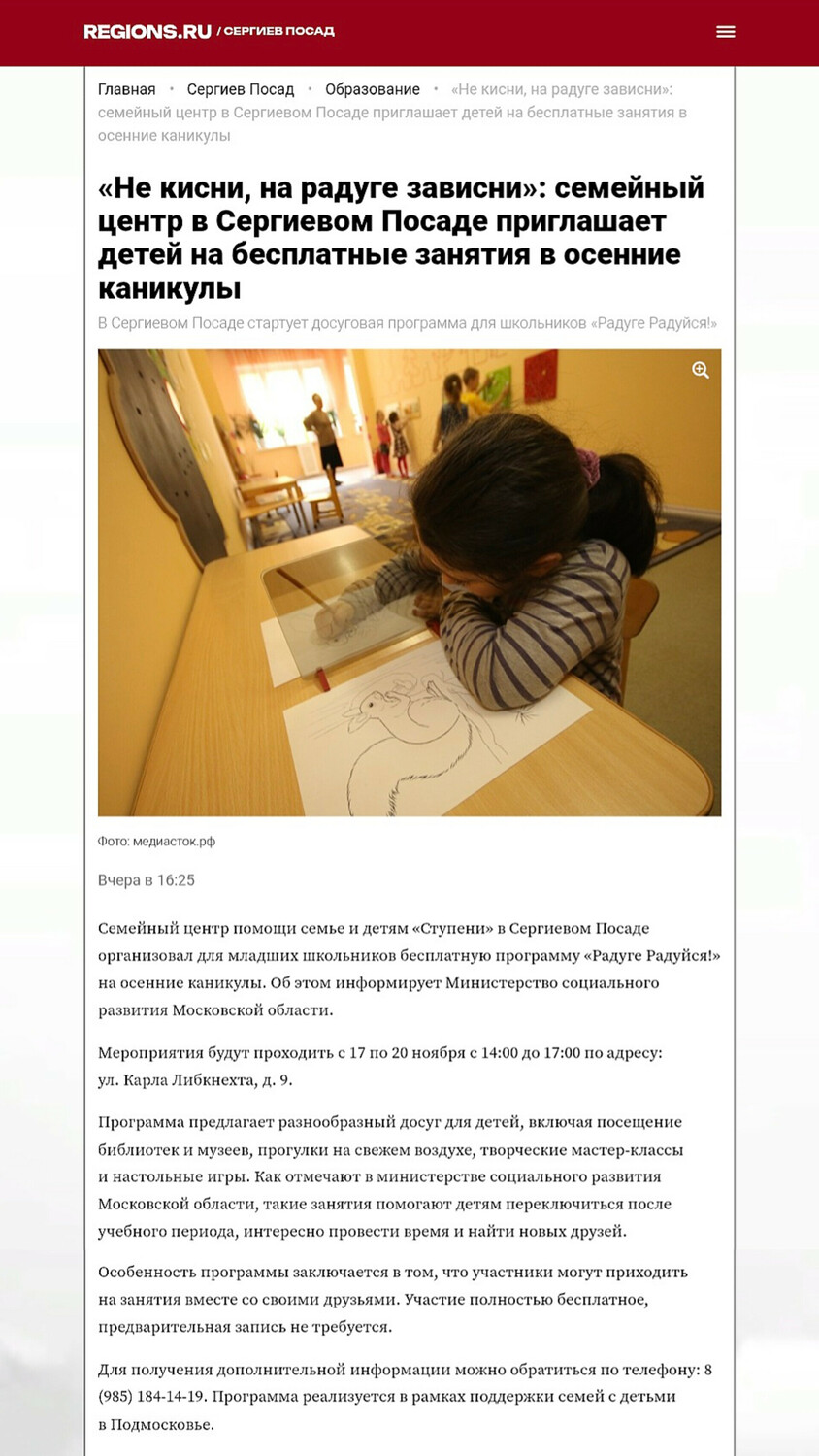 На новостном портале REGIONS.RU вышла статья: «Семейный центр в Сергиевом Посаде приглашает детей на бесплатные занятия в осенние каникулы».