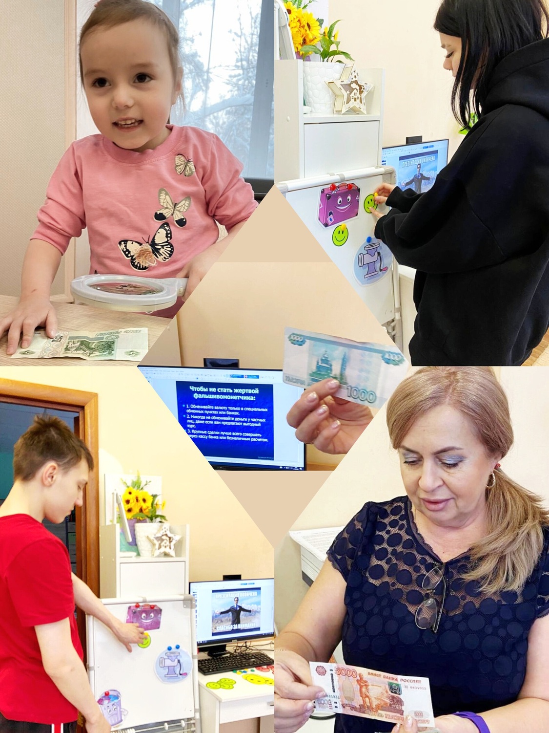 «Защита денег от подделок». Цель занятия – показать, что мошенники могут пытаться завладеть настоящими деньгами, объявляя их фальшивыми, и научить порядку действия с купюрой, если есть подозрение, что она фальшивая. Посмотрели презентацию, рассмотрели настоящие деньги и деньги "банка приколов", провели рефлексию по итогу содержания учебного материала.