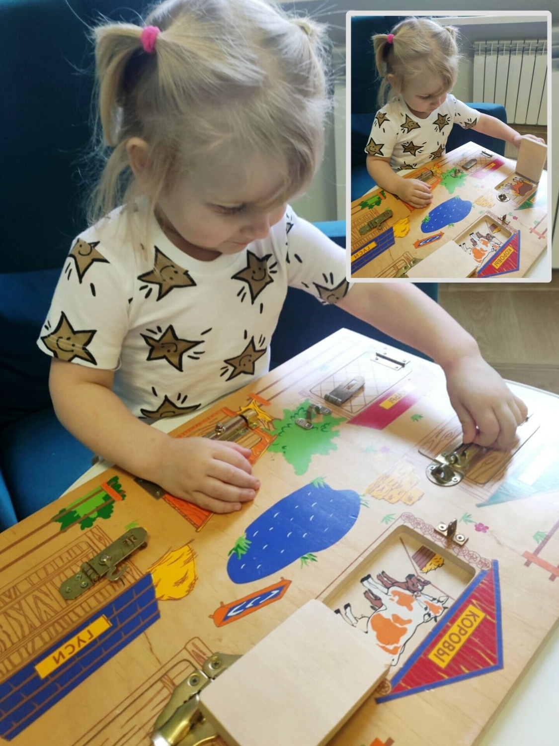 В ходе игры на липучках «Дикие и домашние животные» младшая воспитанница активно участвовала в процессе – прикрепляла картинки к соответствующим местам на доске и узнавала, какие звуки издают эти животные, где они живут и чем питаются.