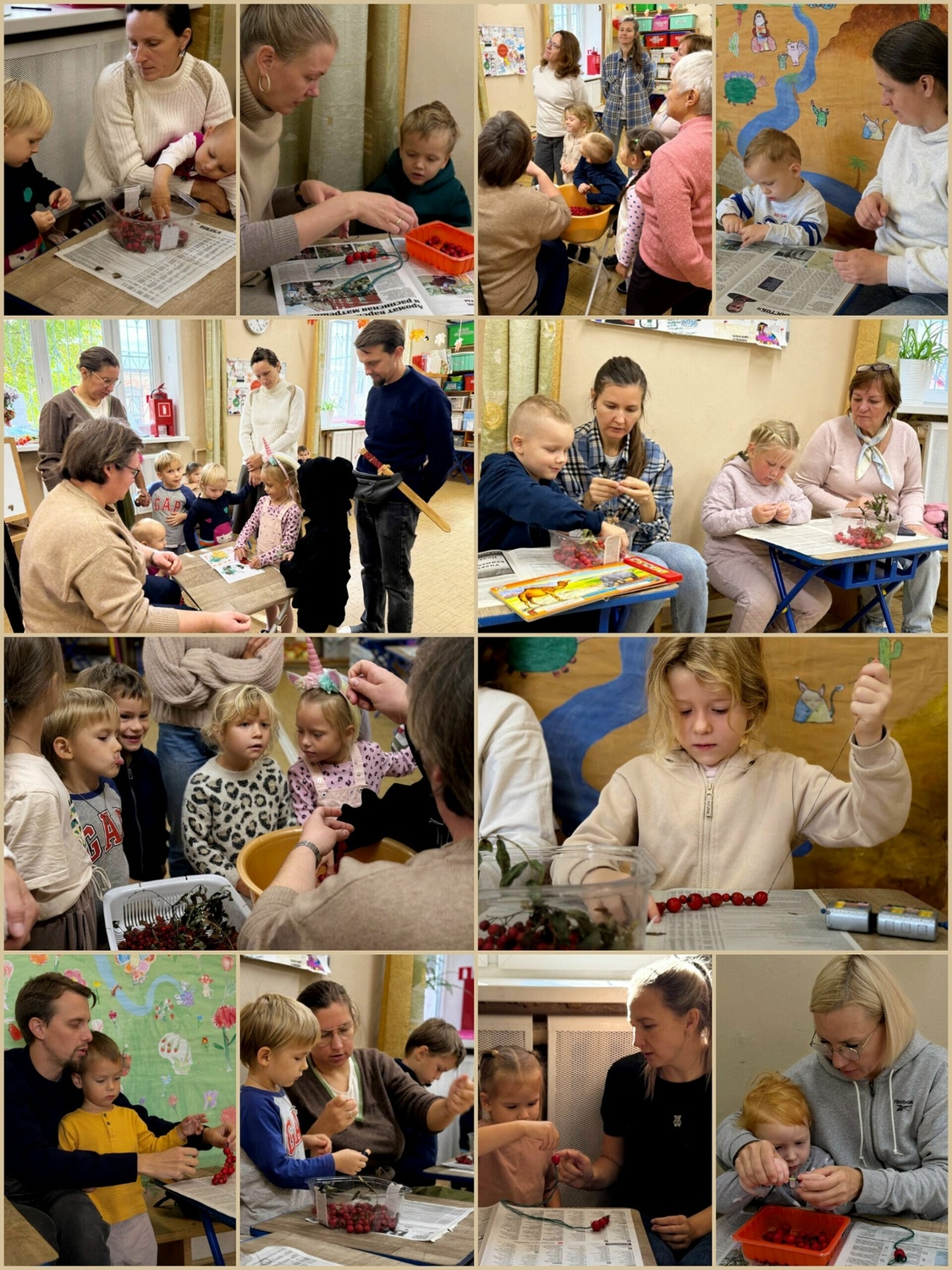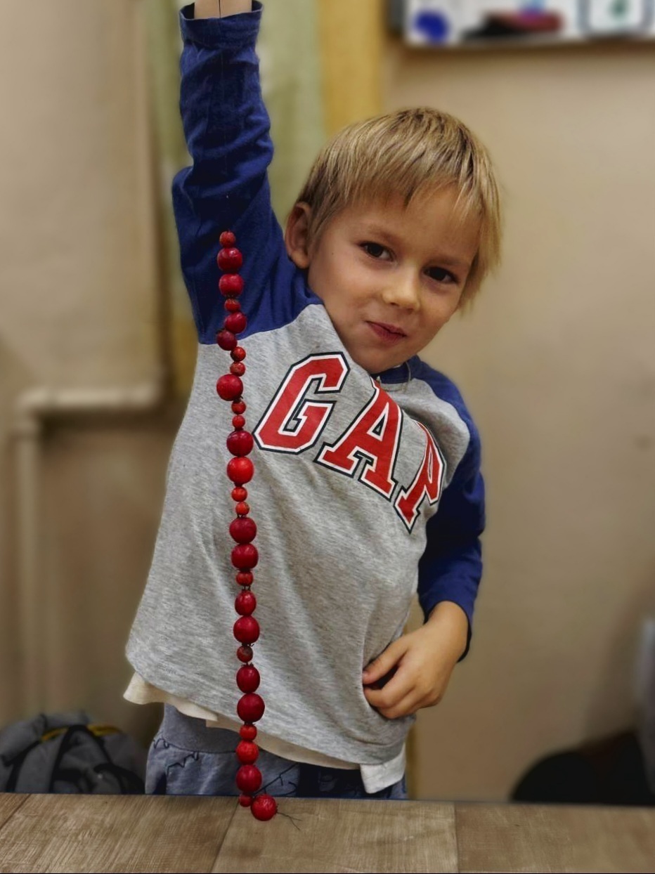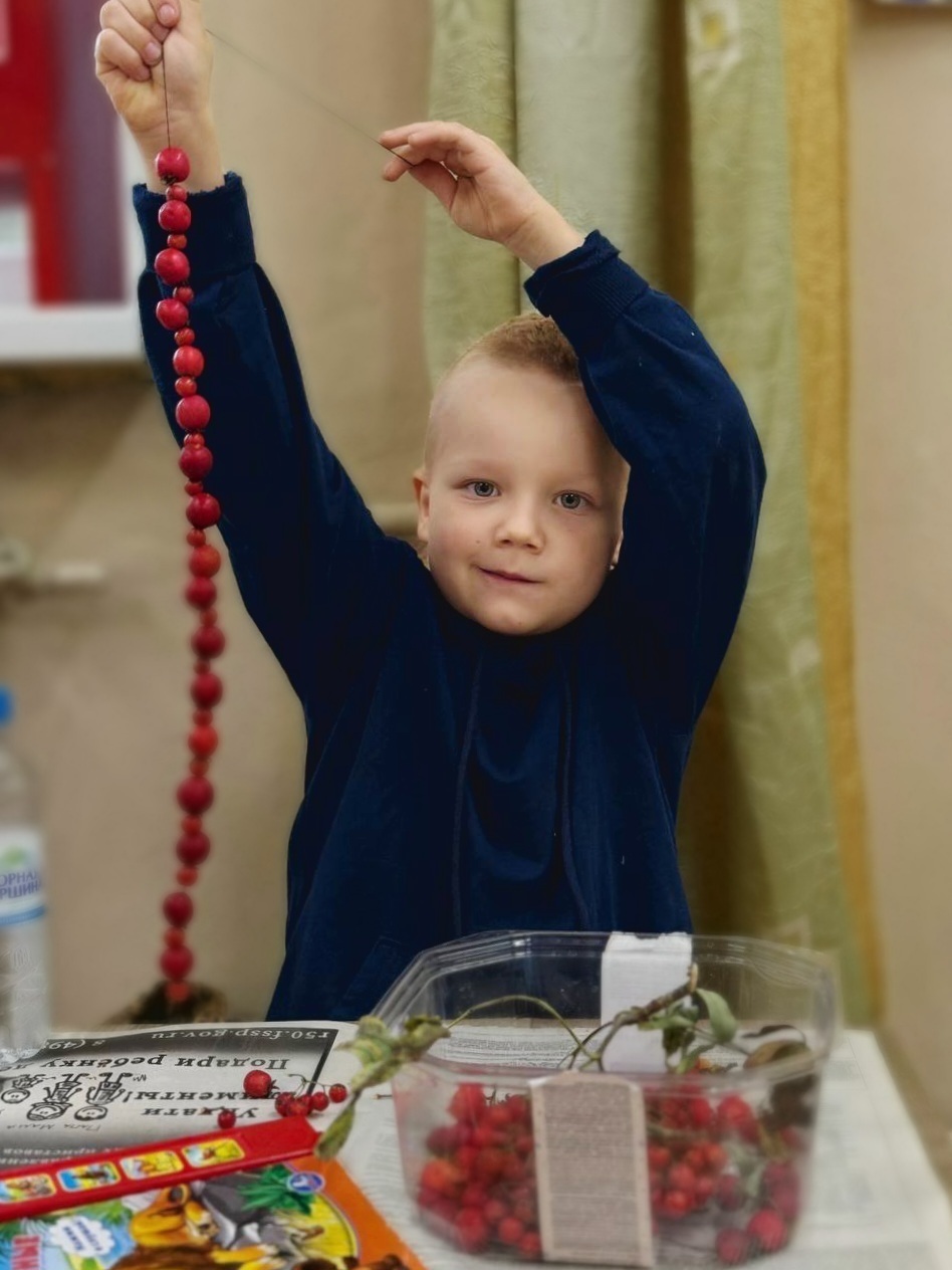 На совместных занятиях в семейном клубе «Малышок» изучаем с ребятами природу, говорим про приметы осени, рассказываем стихотворения и участвуем в творческих мастер-классах с использованием осенних природных материалов: в этот раз сделали чудесные бусы из ягод боярышника
