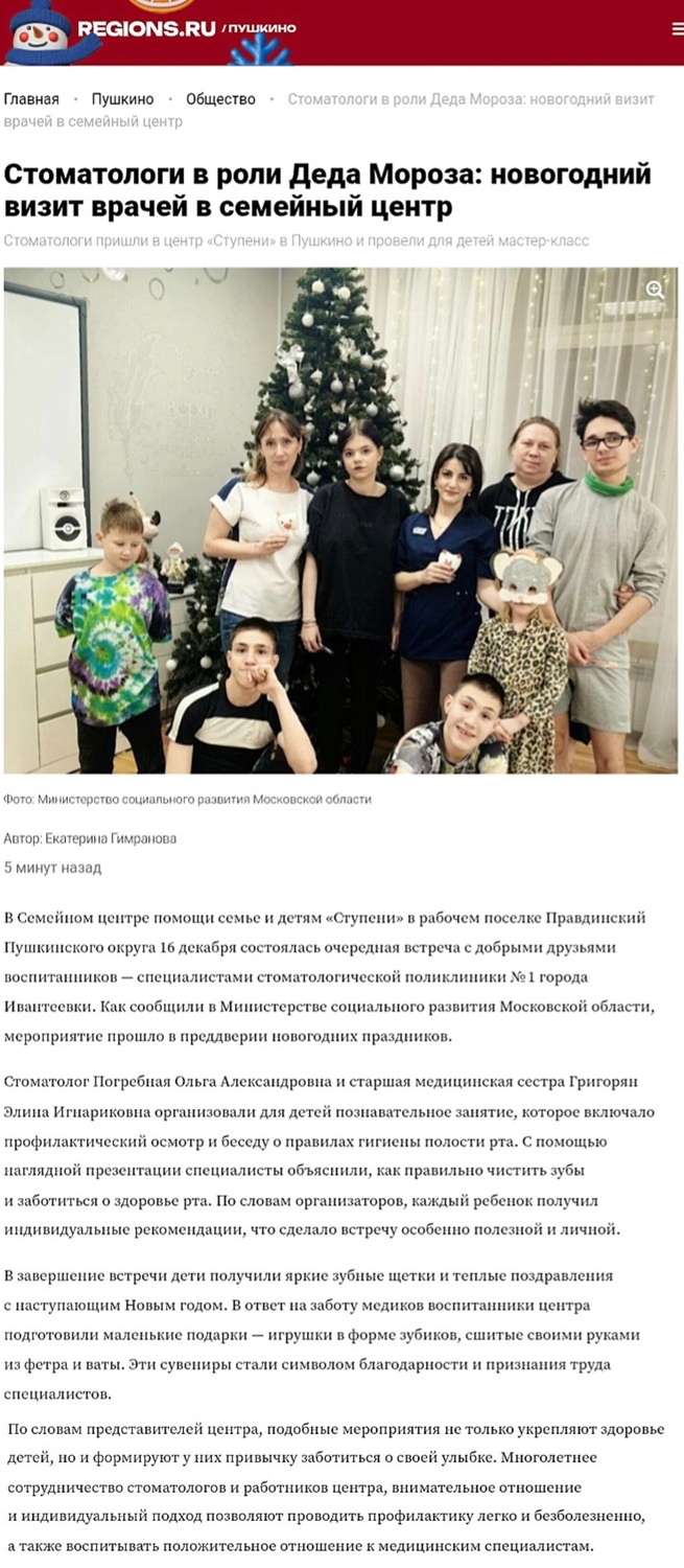На новостном портале REGIONS.RU вышла статья: «Стоматологи в роли Деда Мороза: новогодний визит врачей в семейный центр».