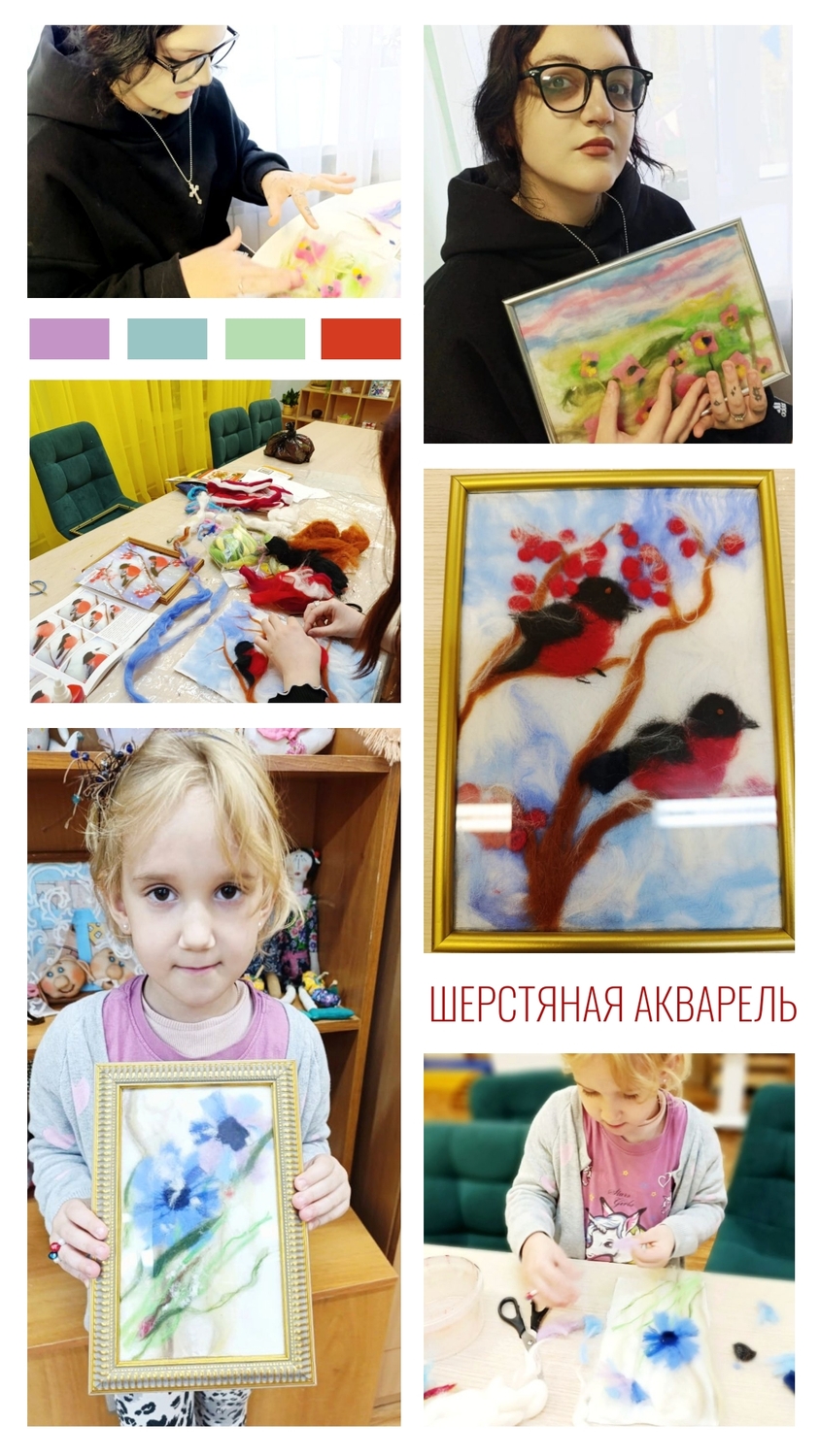 На занятиях в творческой мастерской семейного центра воспитанницы стационара создали из разноцветной шерсти великолепные картины для интерьера с изображением цветов и птиц